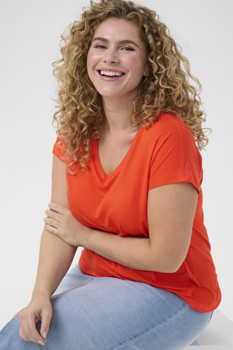 T-shirtDisponible du S au XLDe la marque Kaffe CurveFabriqué en 95% viscose et 5% élasthanneCoupe ampleCouleur rougeCliquez ici pour afficher le guide des tailles